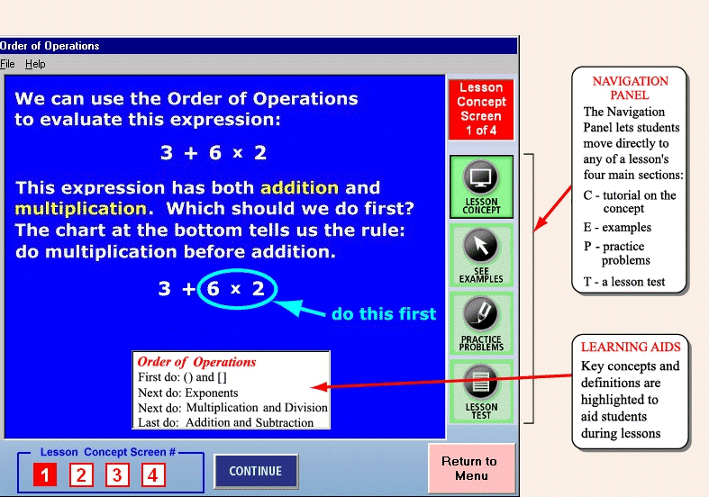at the right edge of the screen, allows students to move directly to any of the four sections of a lesson.