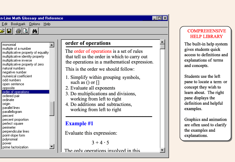 Each program in the MathTutor series contains a comprehensive built-in help library that gives students